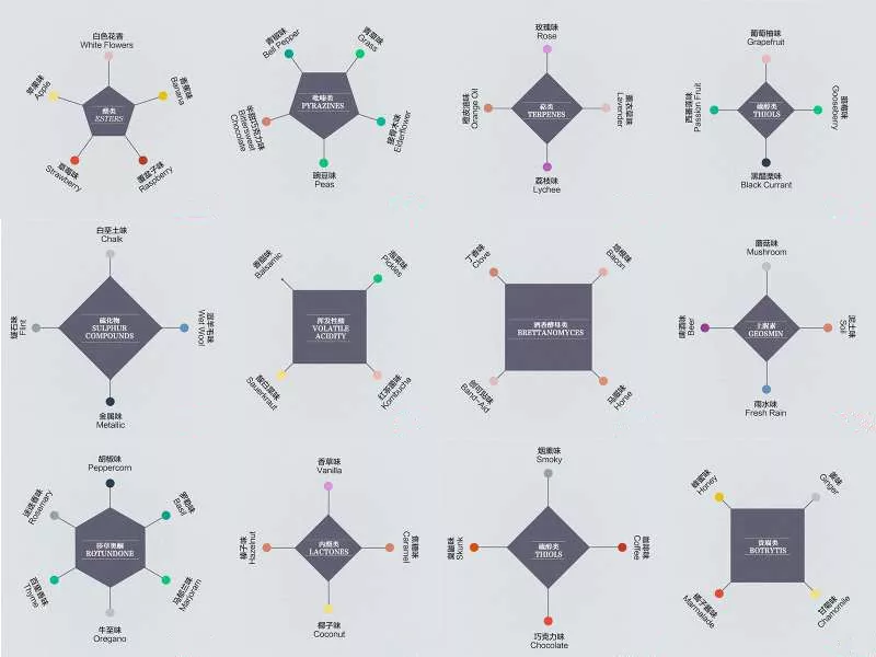 荔枝味、玫瑰花味以及薰衣草味等都是萜類化合物的味道。其中,荔枝味常見於(yu) 瓊瑤漿葡萄酒(Gewurztraminer)中;玫瑰花味常見於(yu) 麝香葡萄酒(Muscate Blanc)中;薰衣草味常見於(yu) 歌海娜和羅訥河穀丘葡萄酒(Cote du Rhone)中;而桉樹味常見於(yu) 澳洲西拉葡萄酒(Shiraz)中。