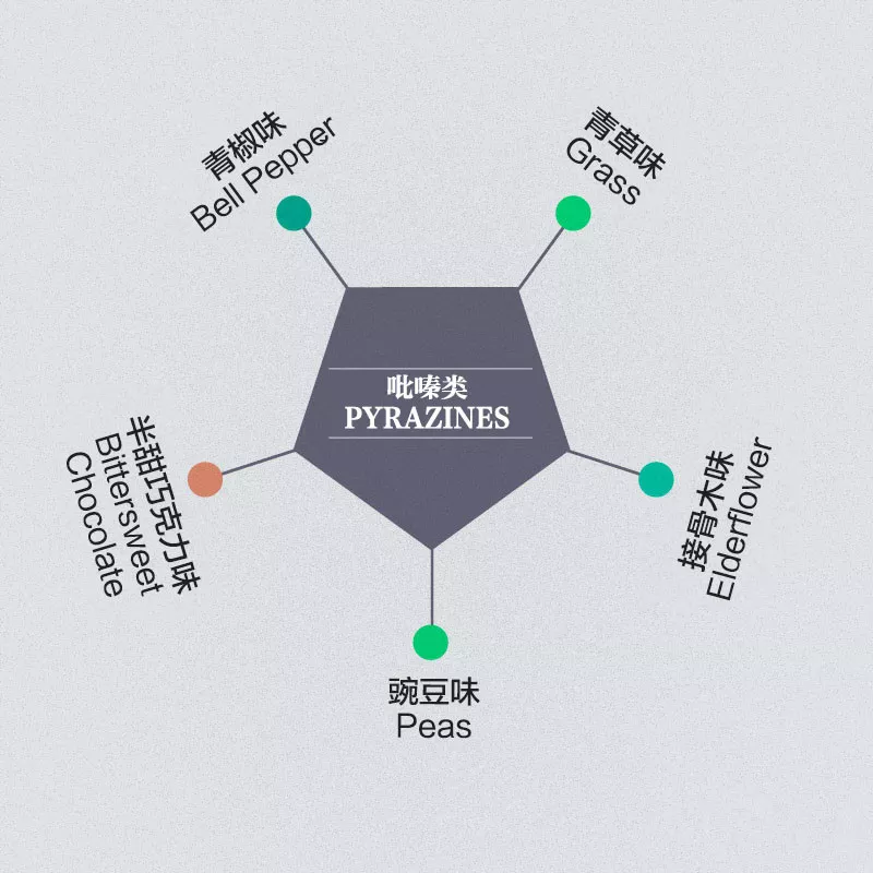 吡嗪類化合物有著類似蔬菜的味道,也是組成巧克力、咖啡等甜香美味的基本成分。在葡萄酒中,吡嗪類化合物是草本植物味主要構成部分。品麗(li) 珠(Cabernet Franc)和佳美娜(Carmenere)就往往伴有青椒味;而長相思(Sauvignon Blanc)的典型香氣就是青草味。
