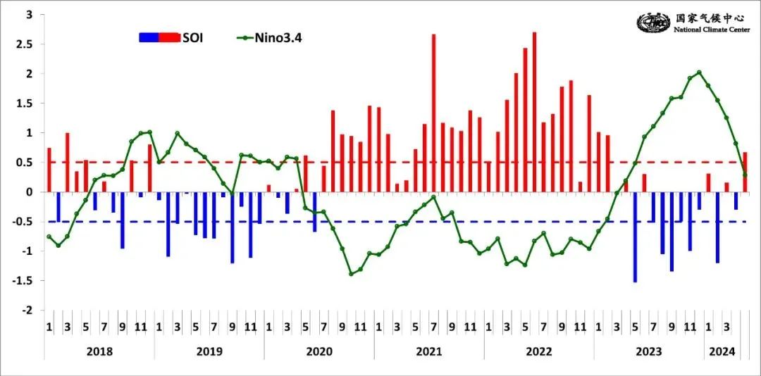 根據國家氣候中心監測顯示,2024年5月,赤道中東(dong) 太平洋海溫較前期明顯下降,Niño 3.4指數為(wei) 0.28℃,3月至5月指數滑動平均值為(wei) 0.78℃。