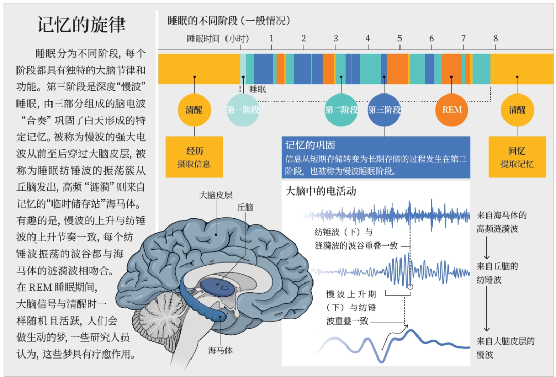 目前的研究發現,尖波漣漪會(hui) 在兩(liang) 種情況下出現:一種是在人類或動物清醒,但處於(yu) 放鬆的非活動狀態下,尤其是在完成任務後安靜休息時,這表明大腦正在回顧和處理與(yu) 任務相關(guan) 的記憶;另一種就是在非快速眼動睡眠(NERM)的第三個(ge) 階段,在這個(ge) 時期,這種腦波起到了將記憶從(cong) 短期存儲(chu) (海馬體(ti) )轉移到長期存儲(chu) (大腦皮層)的作用。