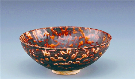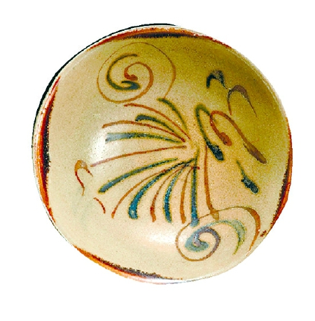 唐代長沙窯大量燒造釉下彩繪瓷器。它突破了青瓷的單一釉色,豐(feng) 富了唐代瓷器的裝飾技術,開創了釉下彩瓷器的先河。長沙窯初期是單一的褐彩斑點,逐漸發展為(wei) 褐綠彩斑點。裝飾內(nei) 容從(cong) 斑點紋發展到花鳥動物紋,或者詩文。其裝飾手法是,借助毛筆用彩料在生坯上繪畫紋飾,然後罩一層透明釉在高溫中燒成。比如長沙窯青釉褐彩雲(yun) 氣紋瓷碗,器身內(nei) 外施青釉,器外壁以四塊褐斑裝飾,外壁釉不及底。碗心以釉下褐彩勾描雲(yun) 氣紋,褐彩線條內(nei) 塗釉下綠彩,整體(ti) 圖案線條流暢。