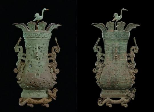蓮鶴方壺,1923年出土於(yu) 新鄭鄭國國君大墓。通高117厘米,重64.28公斤。壺身為(wei) 橢方形,頸部兩(liang) 側(ce) 裝飾了兩(liang) 條回首觀望的龍形怪獸(shou) 構成雙耳,腹部四周四條翼龍仿佛正在緩緩向上爬行,底部兩(liang) 隻張口吐舌、側(ce) 首回望的卷尾獸(shou) ,似乎正在傾(qing) 其全力承托器身。最精彩的還是上層蓋頂怒放的雙層蓮瓣,中央佇(zhu) 立一隻引頸欲鳴、展翅欲飛的仙鶴,被郭沫若先生譽為(wei) “時代精神之象征”。