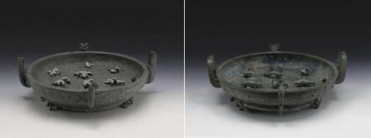 子仲薑盤為(wei) 方唇、折沿、淺腹,底接圈足,下附三卷尾虎支足。盤壁突出竊曲紋,內(nei) 側(ce) 為(wei) 素麵圈,盤中央立有一圓雕雄性水鳥,依次向外同心圓周列,第一圈為(wei) 浮雕的兩(liang) 蛙、兩(liang) 龜,第二圈為(wei) 四條立體(ti) 的魚,第三圈為(wei) 立體(ti) 的4隻雌性水鳥間飾龜與(yu) 蛙,第四圈為(wei) 立體(ti) 的三蛙與(yu) 七隻浮雕的魚。盤內(nei) 所有立體(ti) 動物都能作360度轉動,此種藝術表現手法前所未見,展現了春秋早期鑄造工藝的進步。