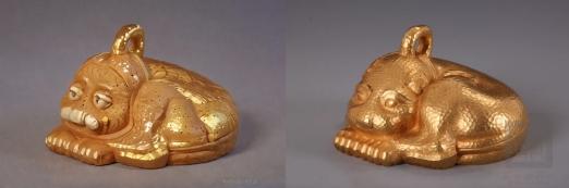 金獸(shou) 長17.5厘米、寬16厘米、高10.2厘米,1982年出土於(yu) 江蘇省盱眙縣南窯莊窖藏。年代最晚可追溯至西漢。整體(ti) 造型屈腰團身,神態警覺,空腹厚壁,澆鑄成形,通體(ti) 錘飾圓形斑紋。腹內(nei) 部刻有“黃六”二字。金獸(shou) 含金量99%,重9100克,是目前我國出土古代黃金鑄器中最重的一件,被稱為(wei) “鎮護之寶”。