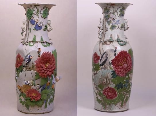 瓶高92cm,腹圍115cm,口徑32cm,底徑31cm,侈口束頸,頸部有兩(liang) 條小龍裝飾,頸側(ce) 有耳。瓶身裝飾圖案為(wei) 牡丹、鬆樹及仙鶴。牡丹代表富貴,鬆樹仙鶴代表長青長壽,寓意“富貴長壽”。