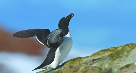 大海雀在陸地上的行動顯得比較遲緩笨拙,在一些凹凸不平的地麵上行走,一蹦一跳的,需要用翅膀幫忙,因此大海雀除了在繁殖季節,很少在陸地上生活。長期以來,為(wei) 了下海潛水捕食,大海雀作出了很大的犧牲,舍棄了飛翔的本領。在水麵上它們(men) 隻能低低滑翔,但深潛技能卻非常了得。