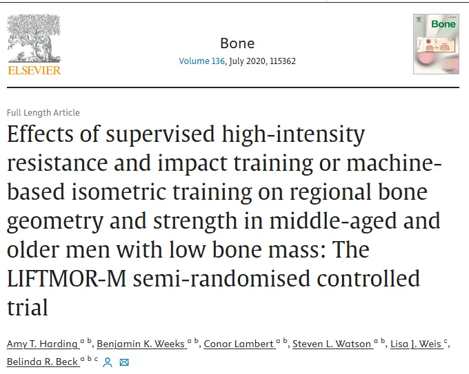 [1]Amy T Harding et al.,Effects of supervised high-intensity resistance and impact training or machine-based isometric training on regional bone geometry and strength in middle-aged and older men with low bone mass: The LIFTMOR-M semi-randomised controlled trial, Bone. 2020 Jul:136:115362. doi: 10.1016/j.bone.2020.115362.
