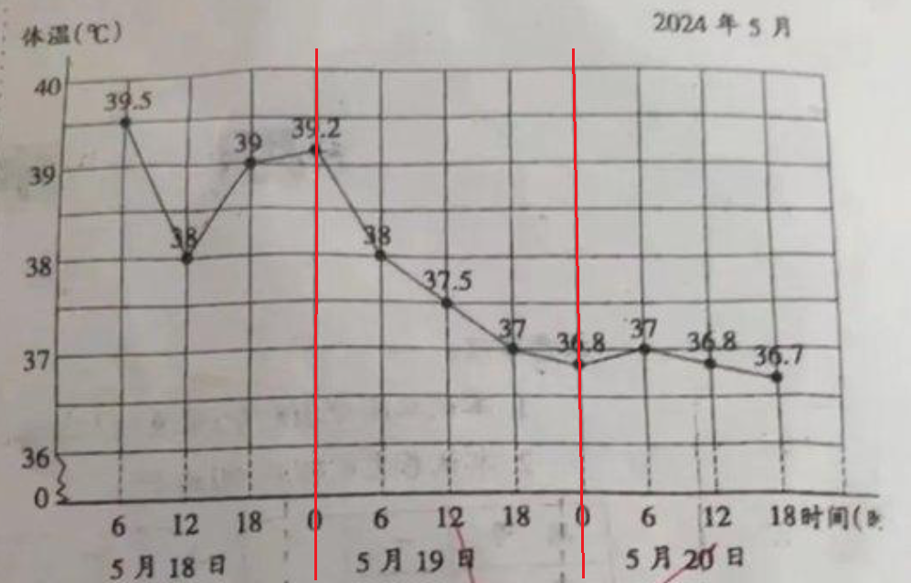 5 月 19 日,第二天。從(cong) 0 點開始,患者的體(ti) 溫呈現持續的下降趨勢,到傍晚時體(ti) 溫已經降至正常值;