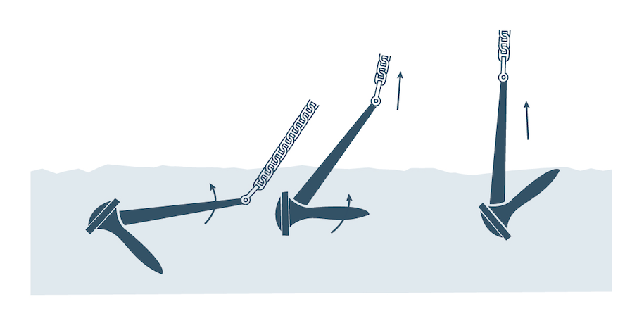將海底的船錨收回來也就是所謂的“起錨”時,船先向前移動,慢慢收鉸錨鏈,在離錨較近的地方拉直錨鏈,錨鏈的拉力會(hui) 把錨杆抬起來,然後錨爪隨之翻轉,底土被翻鬆,然後水手通過錨機收回錨鏈,直到把錨拉出水麵。
