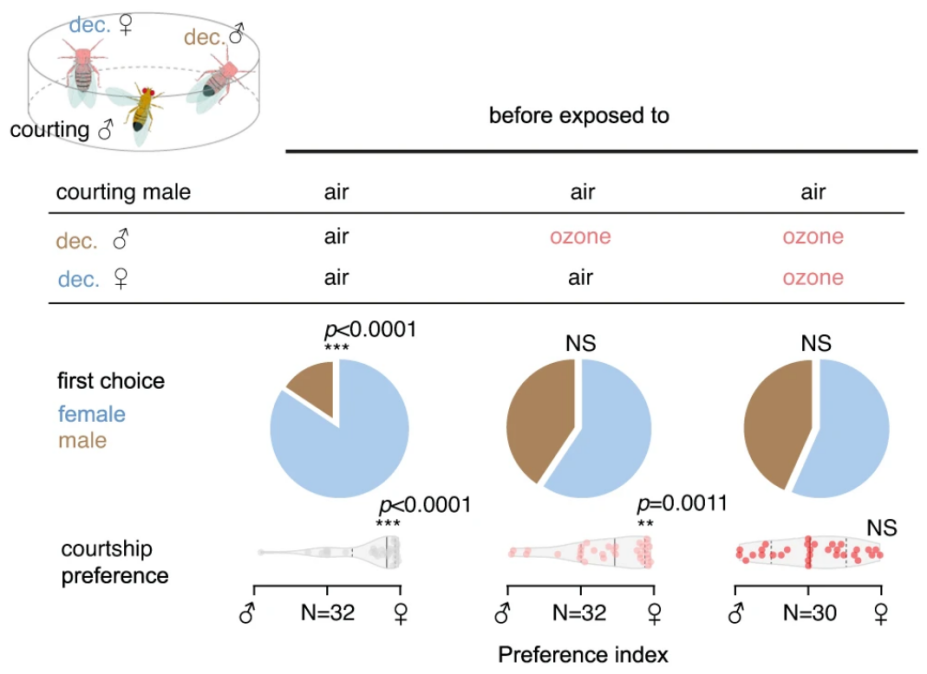 科學家們(men) 通過實驗發現,即使短時間暴露在100ppb濃度的臭氧中,也會(hui) 導致果蠅信息素降解,進而影響其交配行為(wei) 。在實驗中,暴露於(yu) 臭氧的雄性果蠅表現出更長的交配潛伏期,也就是說,它們(men) 需要更多的時間才能被雌性接受。這是因為(wei) 臭氧破壞了信息素,使得雌性難以辨認和接受這些雄性。