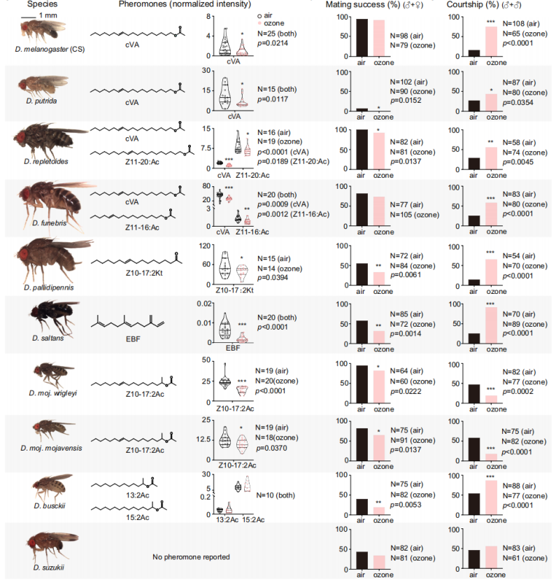 不同果蠅物種特有信息素和其暴露於(yu) 臭氧後性行為(wei) 的變化