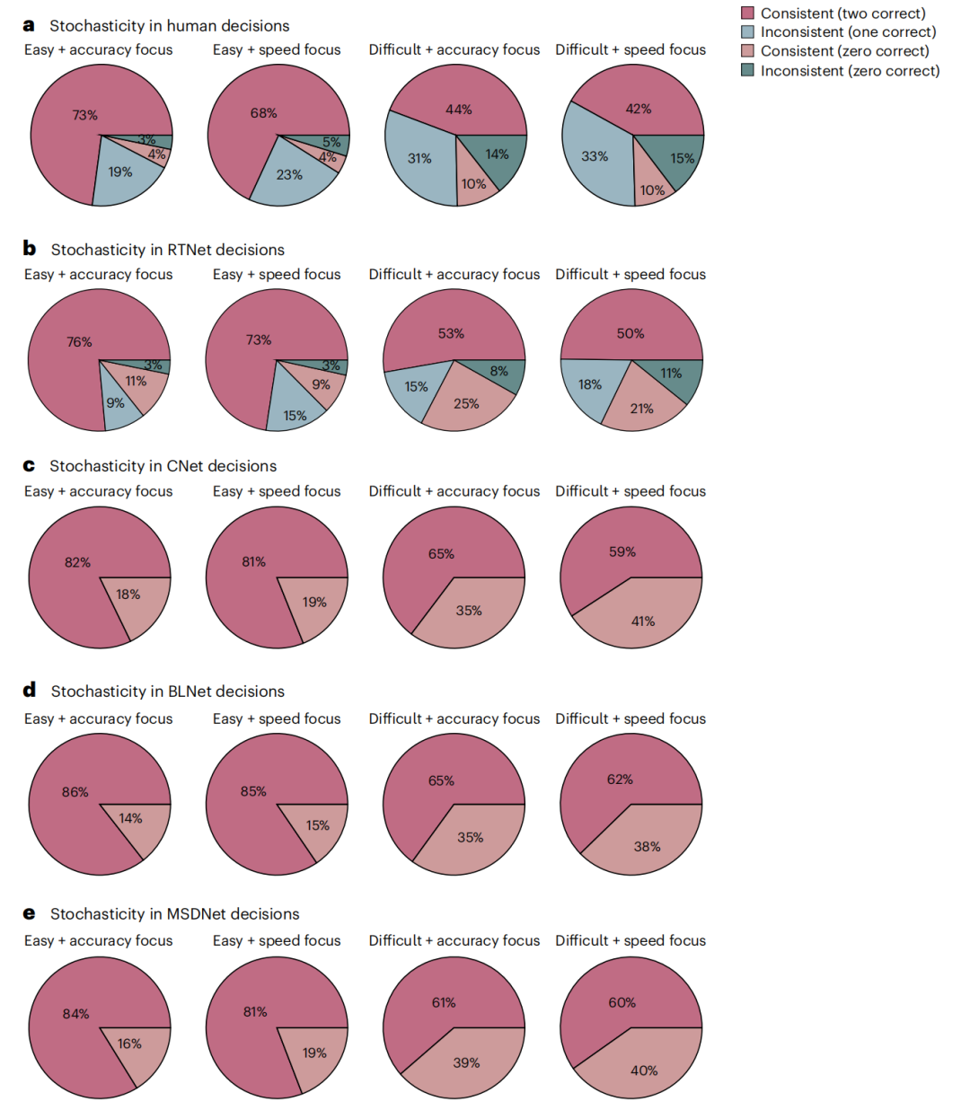 人類行為(wei) 的一個(ge) 核心特征就是決(jue) 策具有隨機性,麵對同樣的情況可能做出不同的決(jue) 策,研究人員將人類行為(wei) 與(yu) RTNet、CNet、BLNet 和 MSDNet 的行為(wei) 進行了比較。
