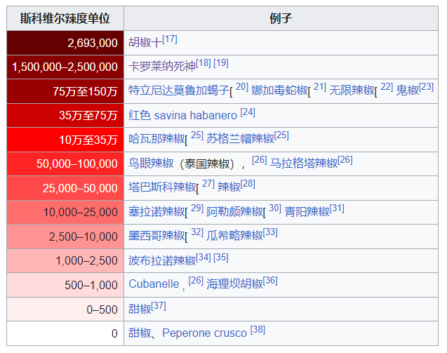 根據斯科維爾辣度單位測量出的全球辣椒辣度排行榜(圖片來源:wikipedia.com)