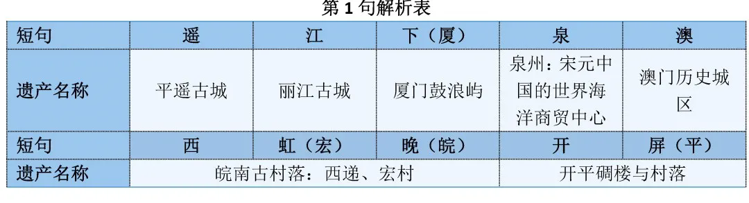 1)第1句+第2句對應城鄉(xiang) 聚落類的11項文化遺產(chan) ,解析表格如下: