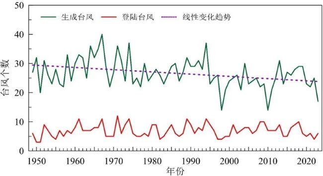 1949年—2023年西北太平洋生成和登陸中國台風個(ge) 數 來源:國家氣候中心