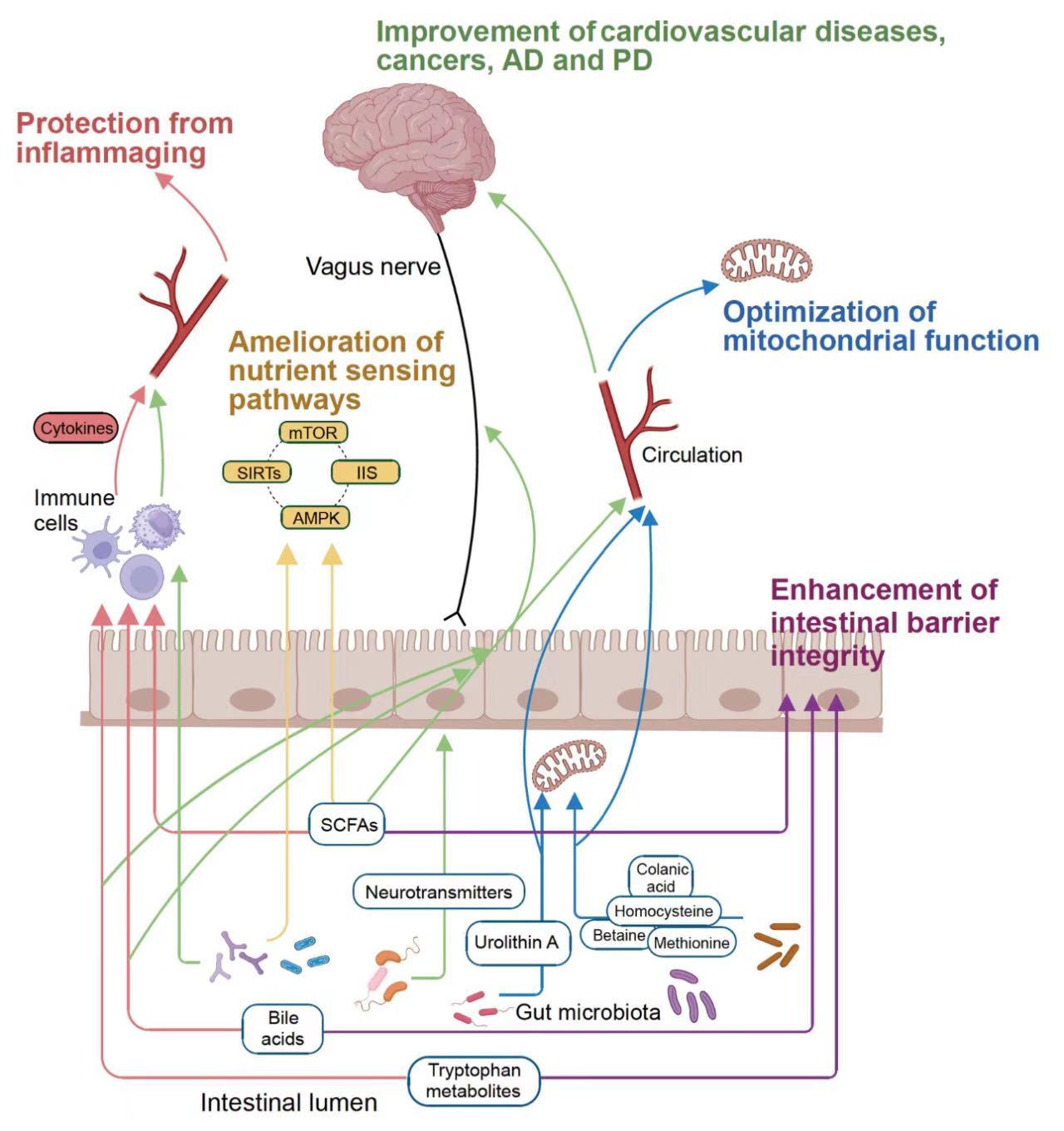 腸道菌群主要通過五條信號路徑促進健康長壽。首先,通過產(chan) 生豐(feng) 富的色氨酸代謝物、吲哚衍生物、短鏈脂肪酸和膽汁酸,腸道菌群能夠增強腸道黏膜屏障的完整性。其次,通過分泌大量的犬尿氨酸、短鏈脂肪酸和膽汁酸,腸道菌群促進抗炎免疫細胞的增殖,進而降低炎症性衰老。第三,腸道菌群及其釋放的短鏈脂肪酸能夠改善營養(yang) 感知信號通路,包括雷帕黴素靶點通路、胰島素/類胰島素生長因子通路、磷酸腺苷活化的蛋白激酶通路和去乙酰化酶通路。第四,通過產(chan) 生豐(feng) 富的莢膜異多糖酸、甜菜堿、甲硫氨酸、半胱氨酸和尿石素A,腸道菌群能優(you) 化線粒體(ti) 功能。第五,通過釋放豐(feng) 富的色氨酸代謝物、吲哚衍生物、短鏈脂肪酸、膽汁酸和神經遞質,腸道菌群能有效地改善心血腦管疾病、癌症以及阿爾茨海默病和帕金森等衰老相關(guan) 疾病。