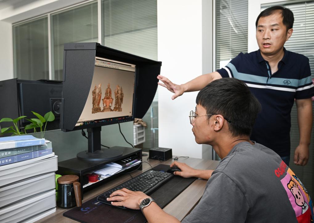敦煌研究院文物數字化研究所,工作人員展示莫高窟彩塑三維重建後的成果。新華社記者 李賀 攝