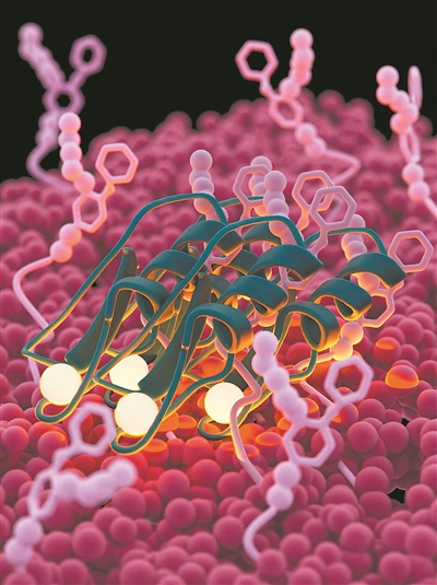 在細菌細胞表麵,菌絲(si) 酶Plectasin分子進一步相互作用,形成密集的超分子結構。這些結構通過多點結合的方式,牢固地附著在細菌膜上,這種自組裝形成了一個(ge) 類似“魔術貼”的致密超分子結構,牢牢地鎖定在細菌表麵。這種多點結合不僅(jin) 增強了酶分子在細菌表麵的穩定性,還提高了其抗菌效果。。