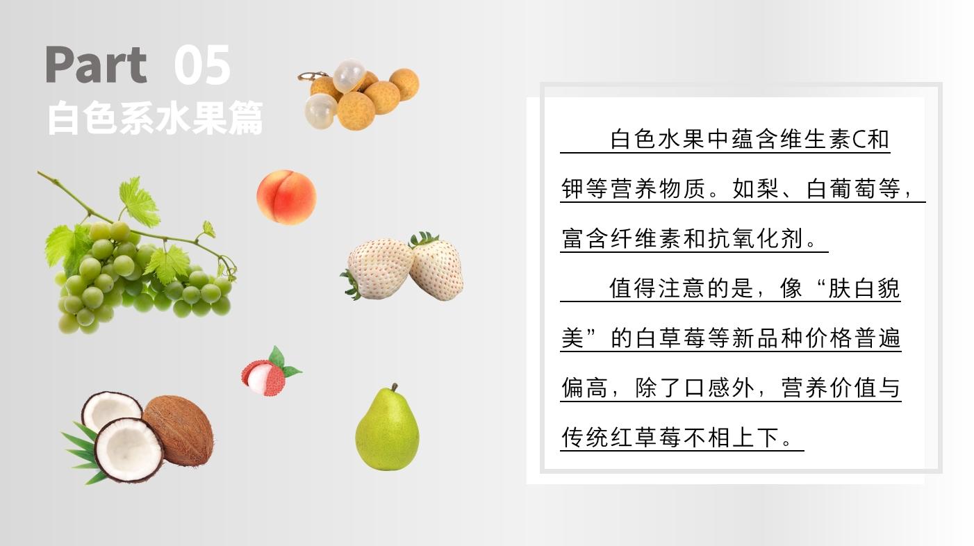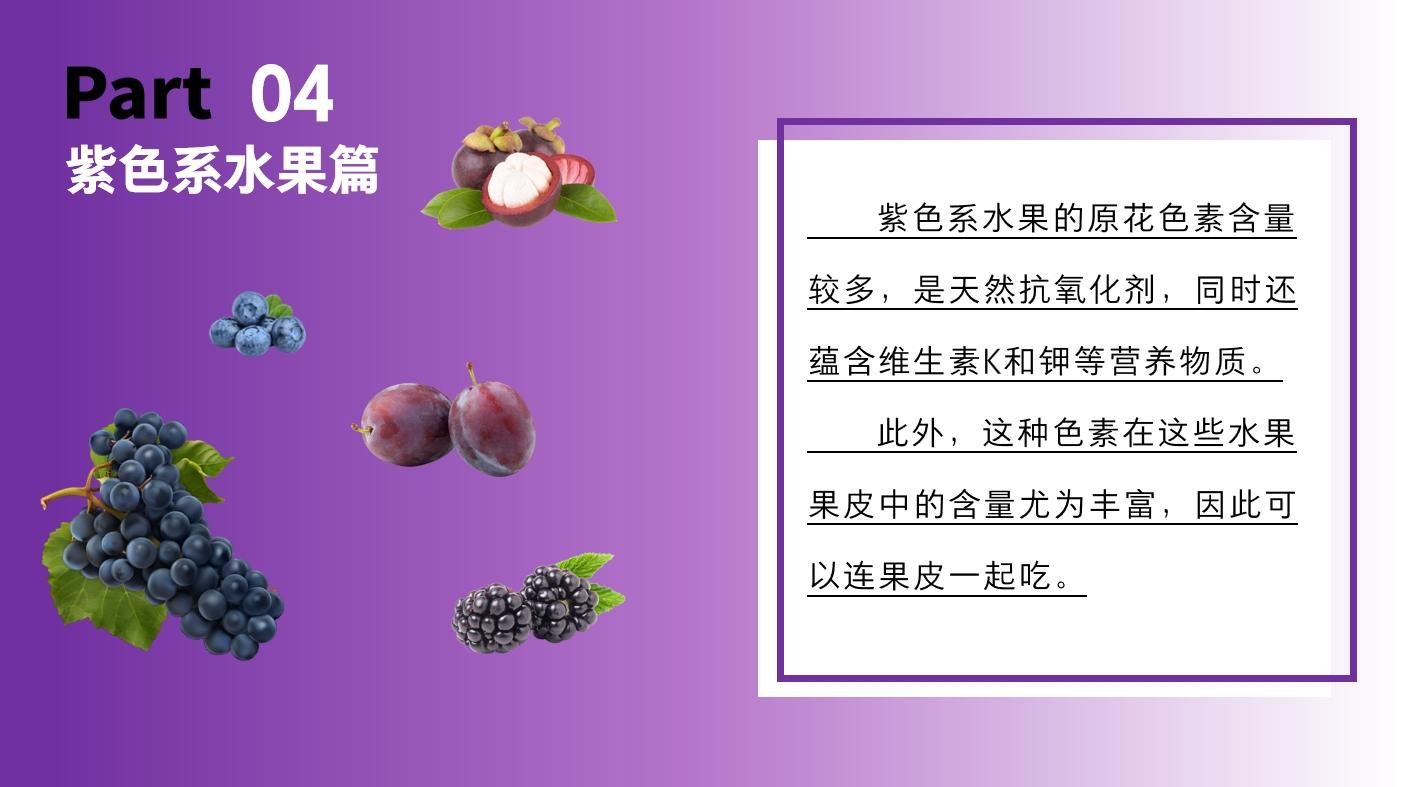 水果之所以色彩豐(feng) 富,主要是有葉綠素、類胡蘿卜素、花青素以及類黃酮素等色素起到的作用。而在選購水果時,大家要避免單選一種顏色的水果。一般來說,深色水果含有的β—胡蘿卜素、多酚類、黃酮類抗氧化營養(yang) 成分更豐(feng) 富,而根據中國居民膳食指南建議,推薦每天攝入200~350克水果。