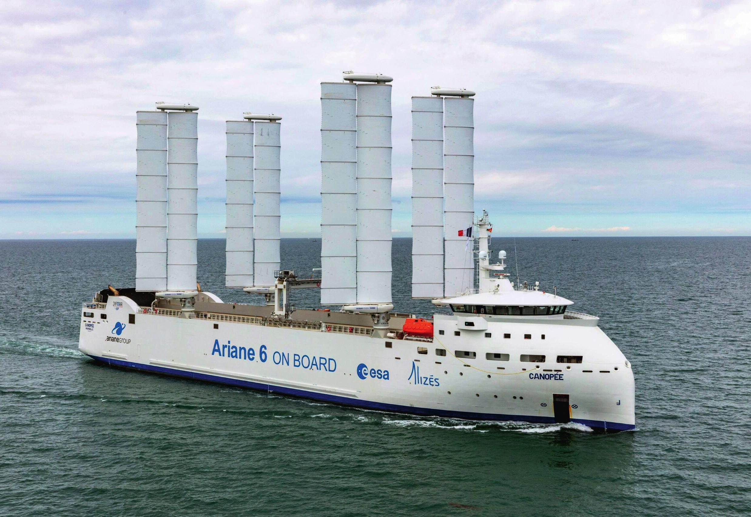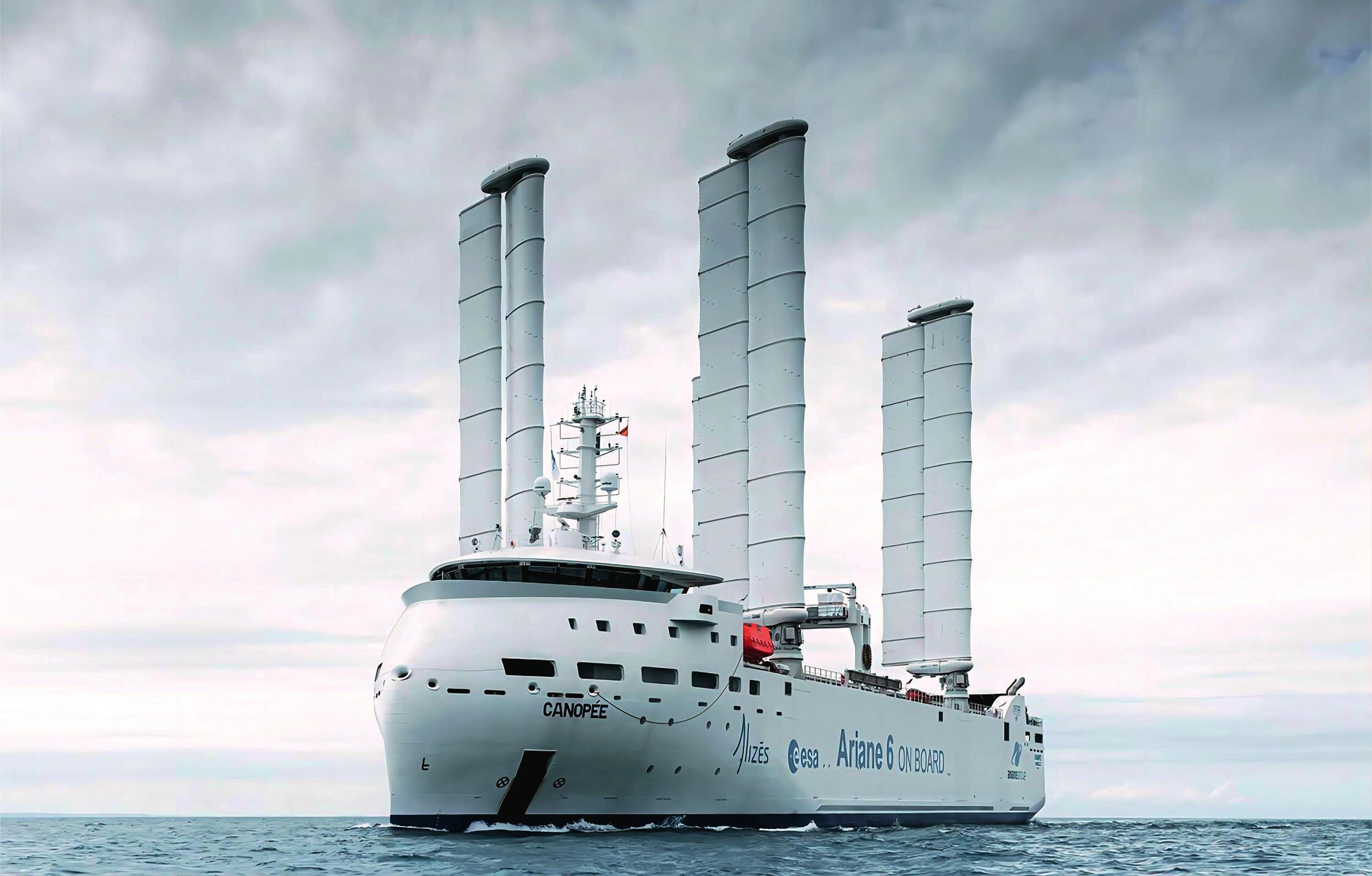 這些可伸縮式風帆由法國AYRO公司發明,被命名為(wei) “海洋之帆”。每張風帆高約37米,4張風帆總麵積接近1500平方米。按設計,每張風帆都能360度旋轉並調整帆麵狀態,借助智能化操控係統,根據風況精細地自動調整姿態,從(cong) 而獲得最大的推力,效率遠遠超過傳(chuan) 統風帆。