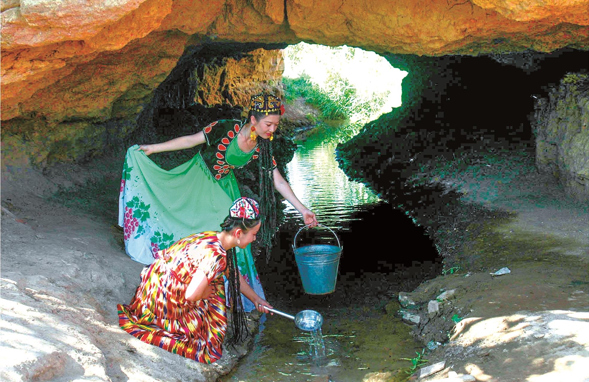 新疆吐魯番市坎兒(er) 井灌溉係統中,暗渠是核心組成部分,具有避免水量蒸發、匯聚地下水、減少土地使用麵積等功能。這是維吾爾族姑娘在坎兒(er) 井打水。劉健 攝