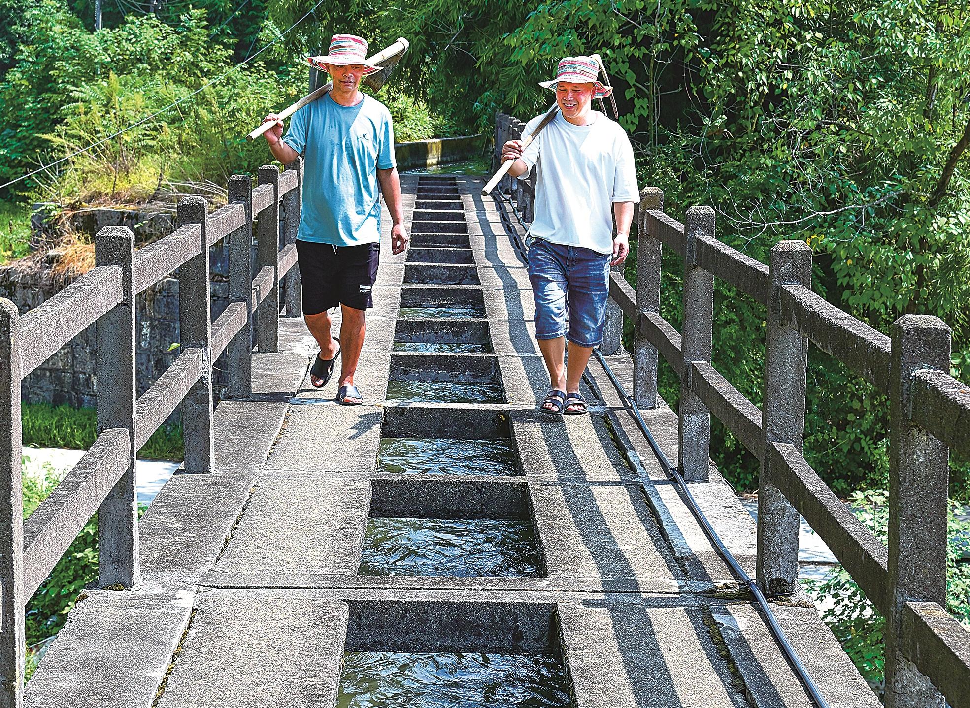 重慶市秀山縣巨豐(feng) 堰最大的特點是,適應丘陵山區灌溉需求的渠-河、渠-渠、渠-路的立體(ti) 規劃。這是當地村民在跨河而建的五拱橋渡槽上巡查。 楊小林 攝