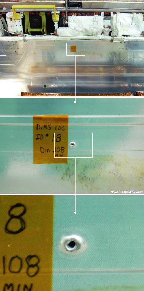 微流星體(ti) 碰撞航天器並非首次。2006年9月9日,阿特蘭(lan) 蒂斯號航天飛機起飛執行STS-115號任務,這次任務主要是為(wei) 了給國際空間站交付兩(liang) 個(ge) 新桁架P3和P4,計劃於(yu) 9月21日返回地球。在檢修時,維修人員在航天飛機右側(ce) 有效載荷艙門的內(nei) 側(ce) 的散熱器上,發現了一個(ge) 直徑約有2.7毫米、穿深約有12毫米的洞。這個(ge) 洞接近氟利昂循環冷卻劑回路。航天飛機上有兩(liang) 個(ge) 這樣的冷卻回路,如果兩(liang) 個(ge) 回路中的一個(ge) 被刺穿,導致氟利昂的泄露並迫使它關(guan) 閉,可能意味著航天飛機被迫提前返回。