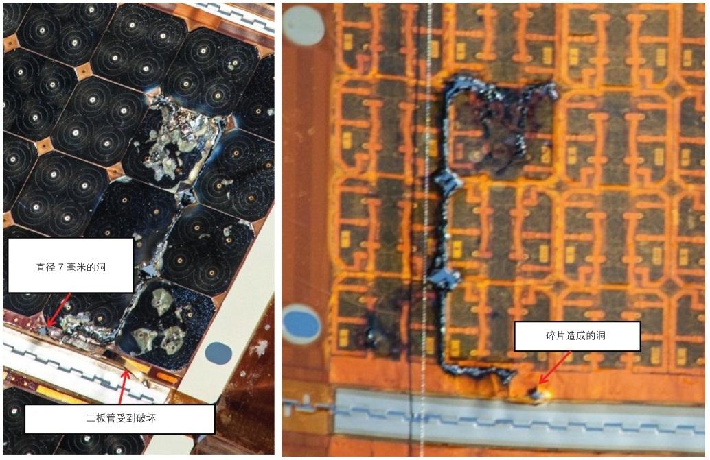 對於(yu) 衛星和空間站太陽電池帆板來說,碰撞損傷(shang) 可能會(hui) 造成短路,供電能力下降。碎片如果對定向和驅動機構的碰撞造成了損壞,可能會(hui) 導致帆板指向偏離太陽光方向,進而降低太陽能帆板供電能力,影響衛星和空間站的用電。如果碰撞到了衛星或者空間站的電池組,則會(hui) 使電池供電能力喪(sang) 失。