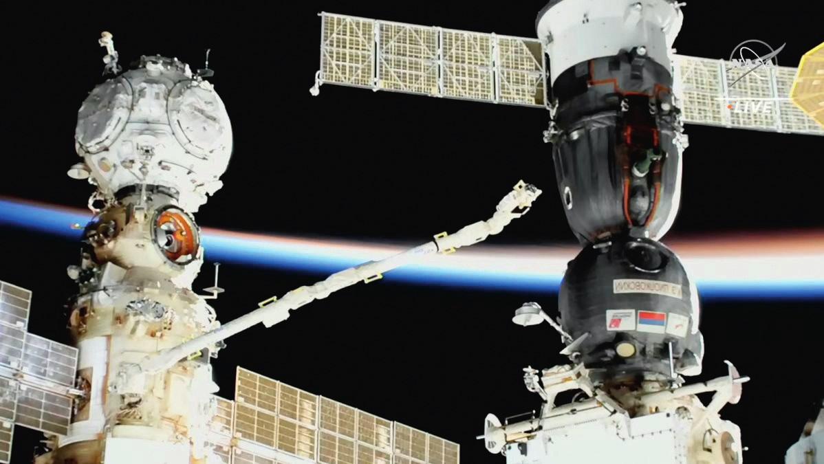 俄羅斯航天員正在使用接駁在科學號艙段上的歐洲機械臂對聯盟號 MS-22 進行檢查