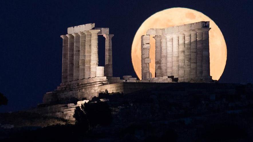 2021年5月26日在希臘蘇尼翁的海神廟遺址拍攝的年度最大滿月 圖源:新華社