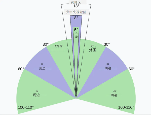 人眼的視覺範圍,黃斑區內(nei) 是人視覺很敏銳的區域,靠內(nei) 進入中央視覺區,視覺最為(wei) 敏銳。(圖片來源:)