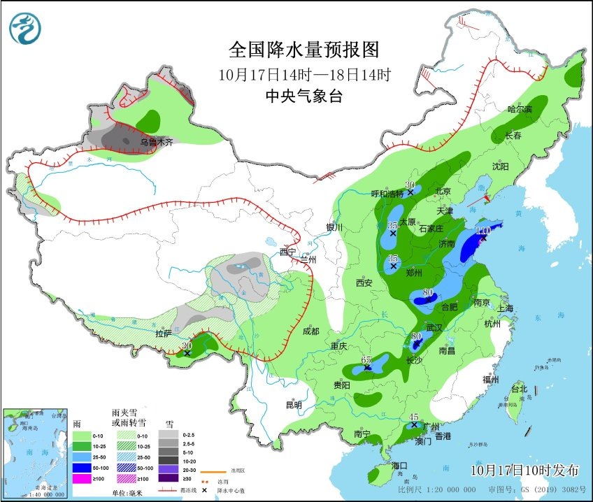 全國降水量預報圖10月17日14時-18日14時(圖片來源:中央氣象台)