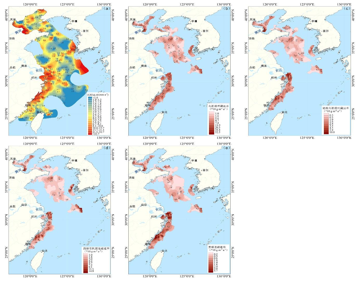 圖2 渤海、黃海和東(dong) 海現代沉積速率(a)、有機碳埋藏速率(b)、陸源有機碳埋藏速率(c)、海源有機碳埋藏速率(d)和黑碳埋藏速率(e)