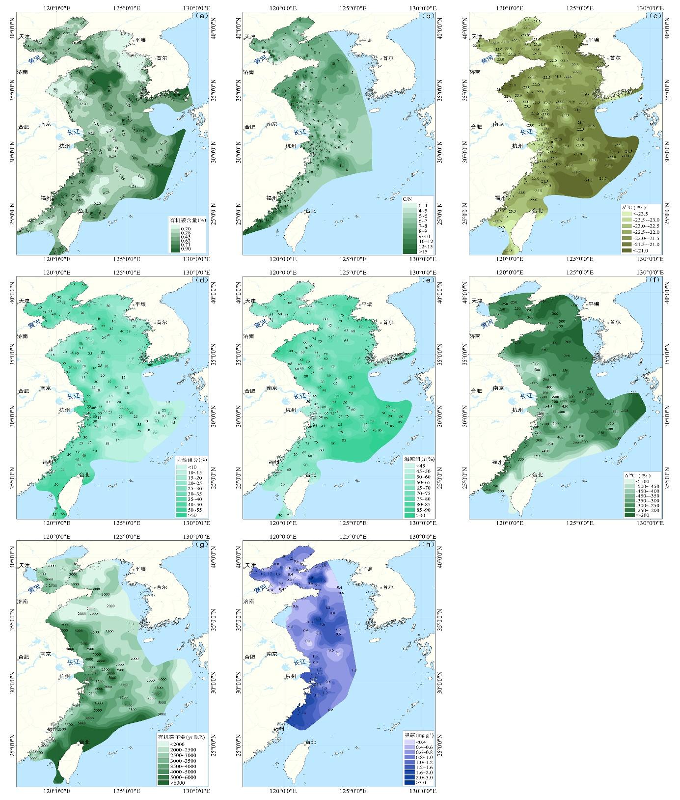 圖1 渤海、黃海和東(dong) 海沉積有機碳及相關(guan) 參數