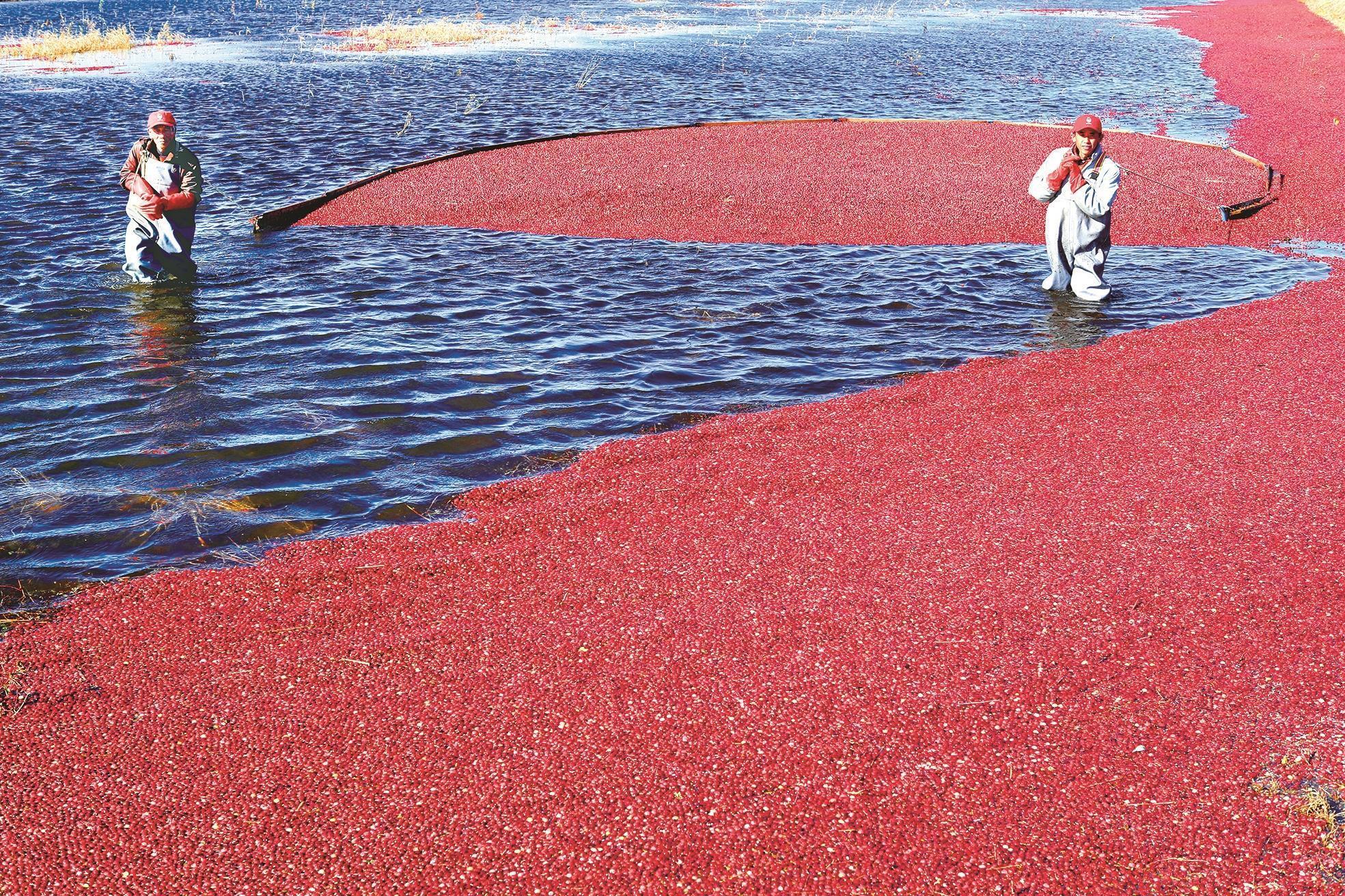 10月11日,工人駕駛著打果機在田間作業(ye) ,一粒粒體(ti) 型飽滿、鮮紅的果實在機器所過之處,像氣泡一般快速地浮出水麵,形成一條長長的紅色彩帶。利用蔓越莓的漂浮特性,在田間注滿水,進行“水收”是蔓越莓采摘最主要的方式。