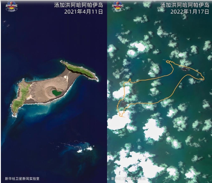 2022年南太平洋島國湯加火山近日劇烈噴發引發海嘯,圖為(wei) 2021年4月11日Worldview02衛星拍攝的湯加洪阿哈阿帕伊島衛星圖片(左)和2022年1月17日“高分一號”衛星拍攝的該島火山噴發後的衛星圖片,橘色曲線為(wei) 按照地理坐標標注出的島嶼原先輪廓。(圖片來源:新華社)