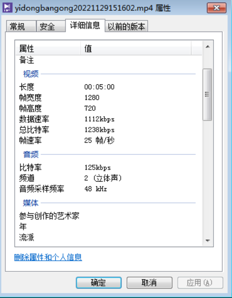計算公式:碼率(Mbps)= 分辨率(像素)× 幀率(fps)× 色彩深度(位)/ 編碼效率(bps/像素),在實際運用中,我們(men) 可以使用碼率(bps)=文件大小(kb)*8/時長(秒)來進行計算,例如一個(ge) 大小為(wei) 44.4M時長為(wei) 5分鍾的mp4視頻,其碼率為(wei) 44.4*1024*8/(5*60)=1212bps。在windows中可以通過查看視頻文件的屬性,在詳細信息中看到視頻相關(guan) 參數,如下圖所示,可以看到和我們(men) 測算的碼率相差不大。