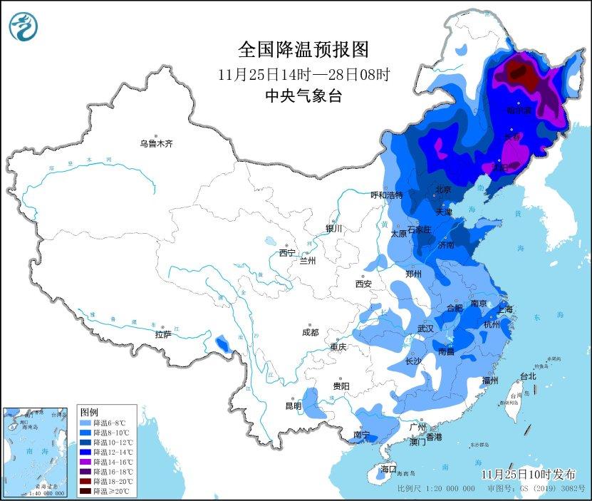 預計,11月25日14時至11月27日14時,內(nei) 蒙古中東(dong) 部、華北、東(dong) 北地區中南部、黃淮、江淮、江漢東(dong) 部、江南北部等地將先後降溫6~10℃,其中,內(nei) 蒙古中部、華北北部、東(dong) 北地區中南部等地部分地區降溫可達12℃以上。