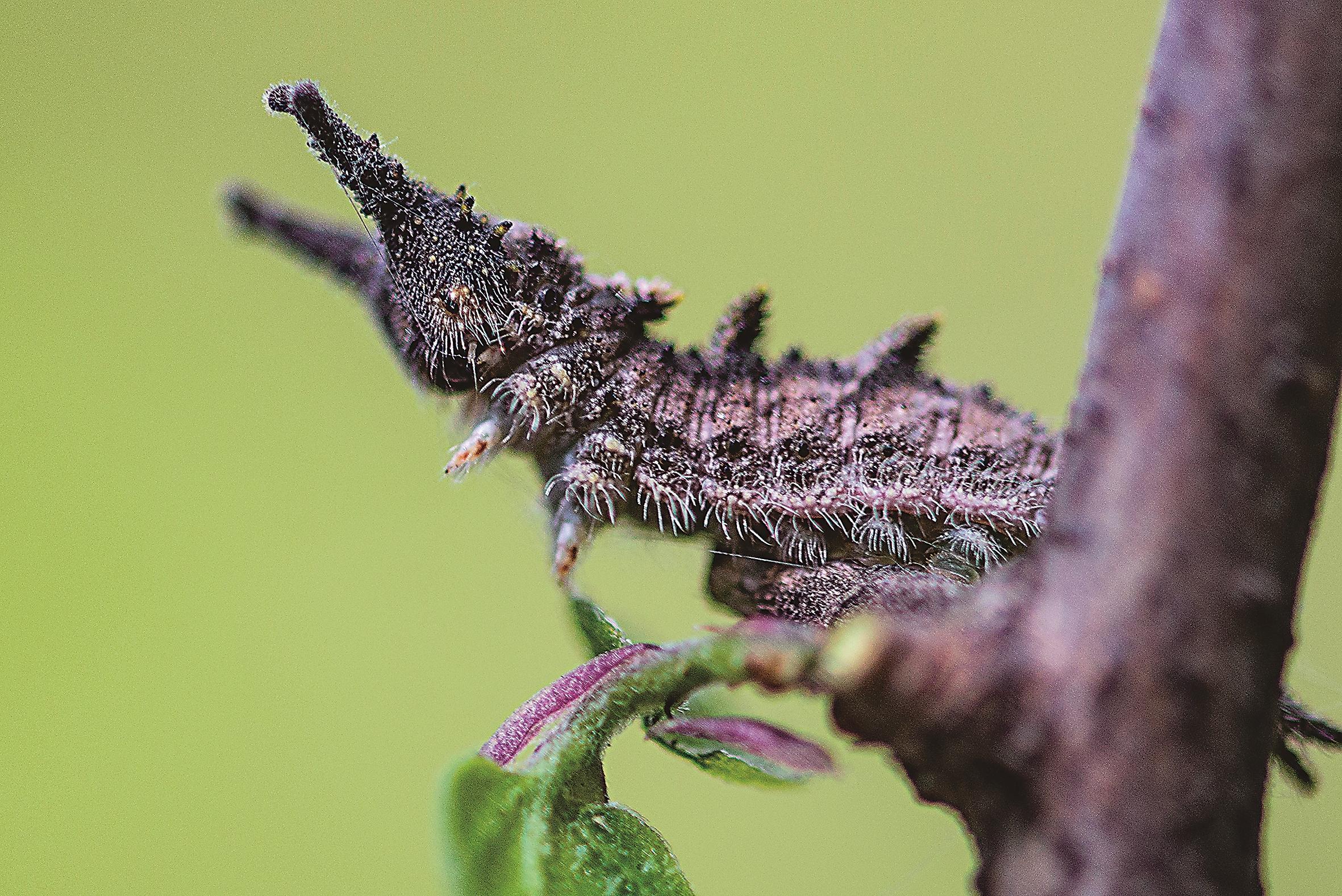 以幼蟲形態越冬的蝴蝶,幼蟲會(hui) 從(cong) 樹枝或植物上爬下來,找個(ge) 避寒的地方開始“冬練三九”,或吐絲(si) 築巢抱團取暖,或以枯葉為(wei) 棉被越冬。為(wei) 適應環境變化,幼蟲大多會(hui) 把一身綠衣換成灰褐色“鎧甲”,讓自己完全隱蔽於(yu) 環境中,躲避天敵的蠶食,以“騙術”求生存。