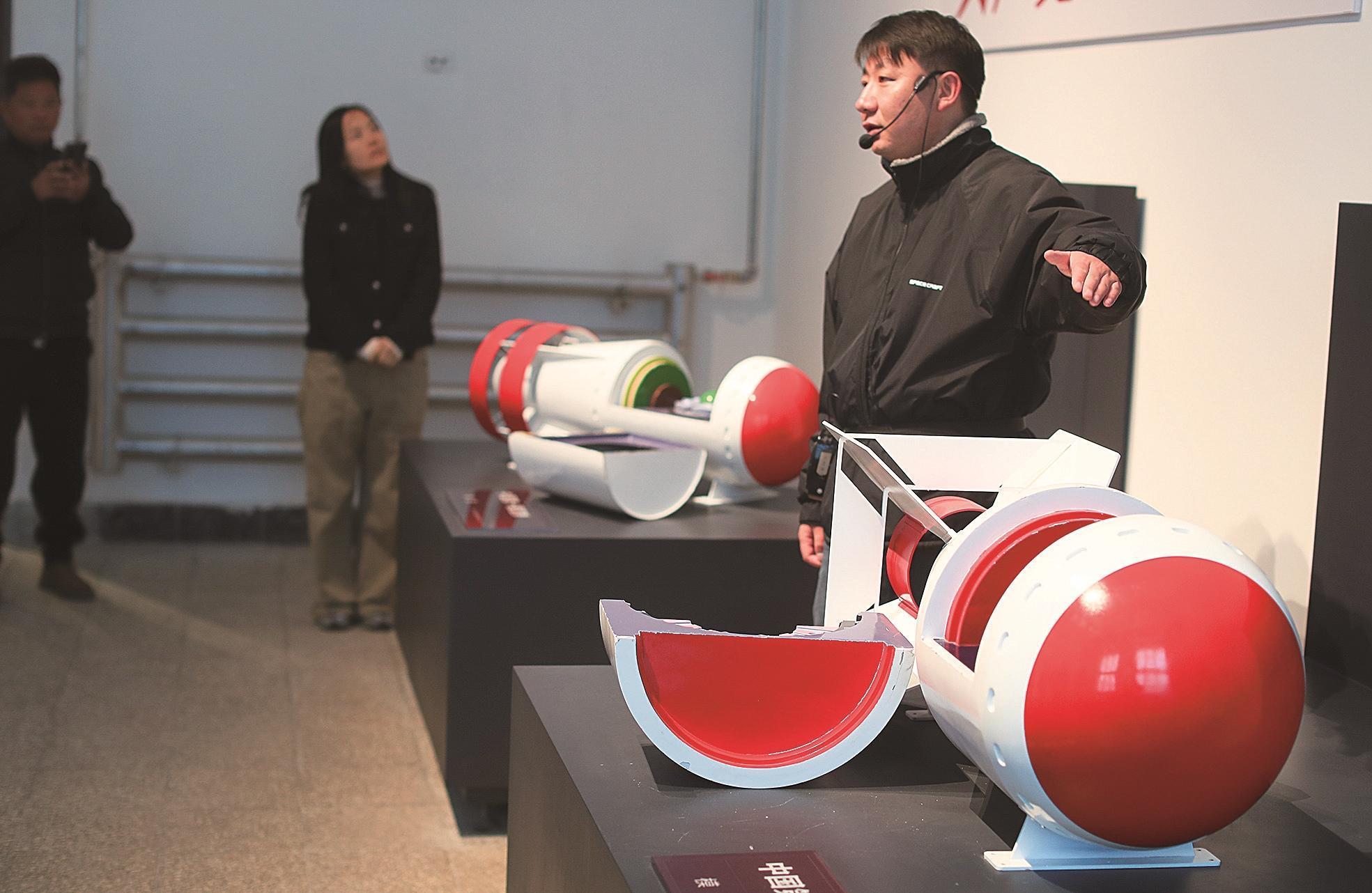 2024年11月23日,講解員在221基地,向參觀者講解“兩(liang) 彈”的研製曆史。