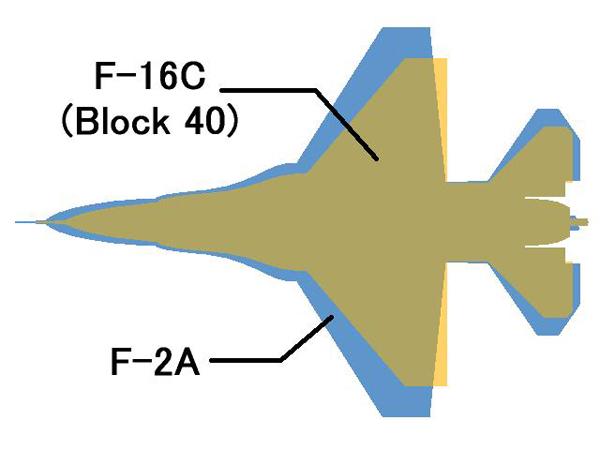 F-2的氣動布局與(yu) F-16相似,單座、單發、單垂尾的設計,采用機腹進氣道。機身長度為(wei) 15.52米,翼展約11米,高4.96米。相比F-16,F-2加長了機身,增加了武器掛載與(yu) 內(nei) 部燃料。機翼進行了重新設計,翼尖可以發射空空導彈,翼麵積增加了25%,翼麵積為(wei) 34.84平方米,機翼後掠角度與(yu) 水平尾翼外形都與(yu) F-16有著明顯的不同,有利於(yu) 提升飛機的荷載與(yu) 航程。F-2的機身與(yu) 機翼使用了大量的複合材料與(yu) 新型製造工藝,既能減輕自重,也能在一定程度上減少飛機的雷達散射截麵積。
