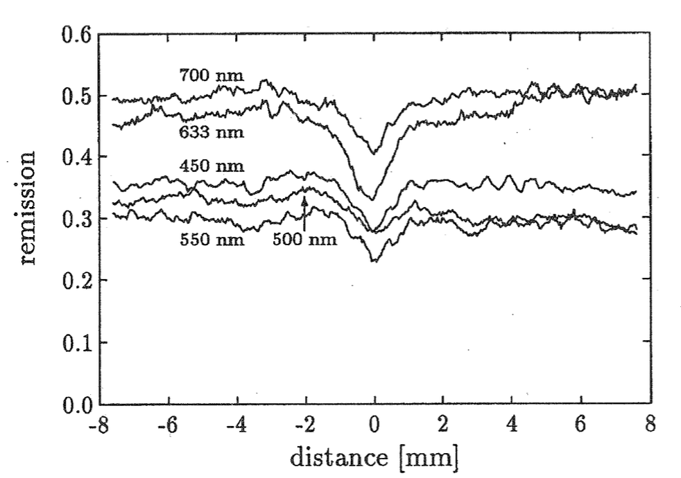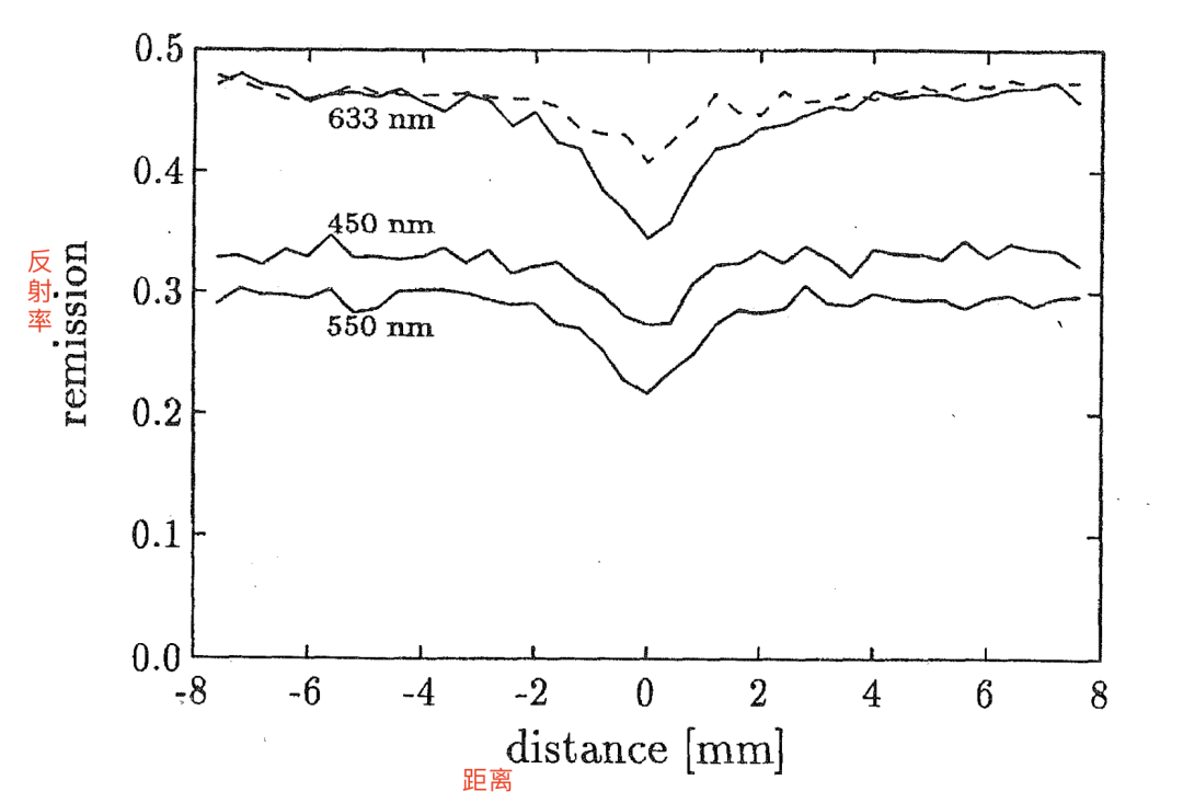 圖一 模擬短波長(450 nm,藍光)、中波長(550 nm,綠光)和長波長(633 nm,紅光)穿過皮膚後從(cong) 靜脈區域反射的強度變化