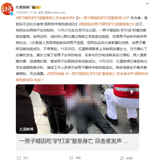 北京天壇公園內(nei) 一名男子疑因吃“驢打滾”時噎住喉嚨窒息。目擊者表示,當時有熱心群眾(zhong) 通過海姆立克急救法施救,但男子始終未能將異物吐出。送到醫院最終搶救無效死亡。
