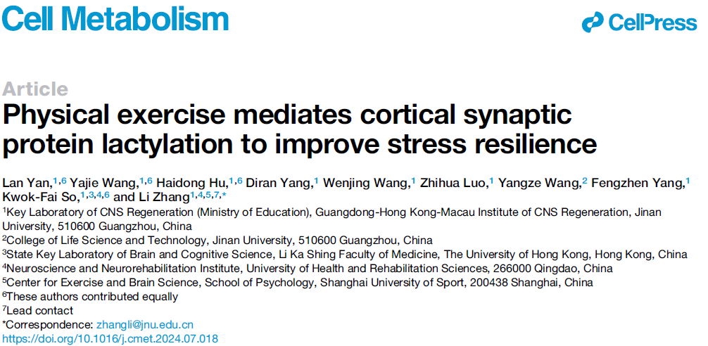 我們(men) 在運動的過程中會(hui) 產(chan) 生關(guan) 鍵的代謝物——乳酸。2024 年 8 月,暨南大學粵港澳中樞神經再生研究院張力團隊在《細胞》雜誌子刊《細胞代謝》上發表的一項研究發現:運動後產(chan) 生乳酸,使得血液和大腦中的乳酸水平顯著升高,此時乳酸分子會(hui) 促進大腦皮層中特定突觸蛋白的乳酰化,從(cong) 而有效緩解由壓力引起的焦慮。