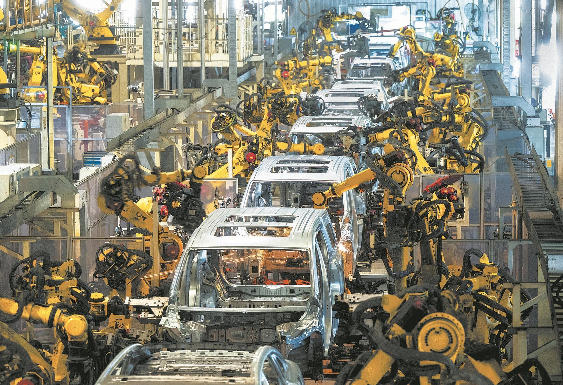 2024年4月1日,湖北武漢經開區,機器人在新能源汽車生產(chan) 線上作業(ye) 。