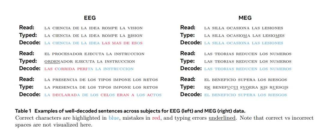 圖|解碼表現較好的 EEG 和 MEG 文本對比,正確解碼字符標為(wei) 藍色,錯誤為(wei) 紅色