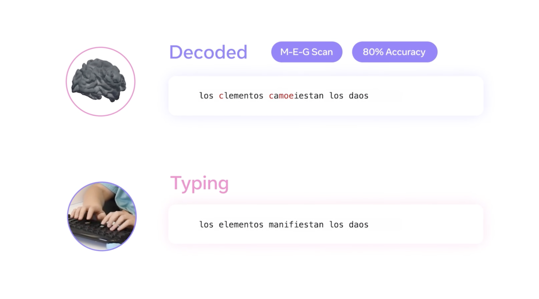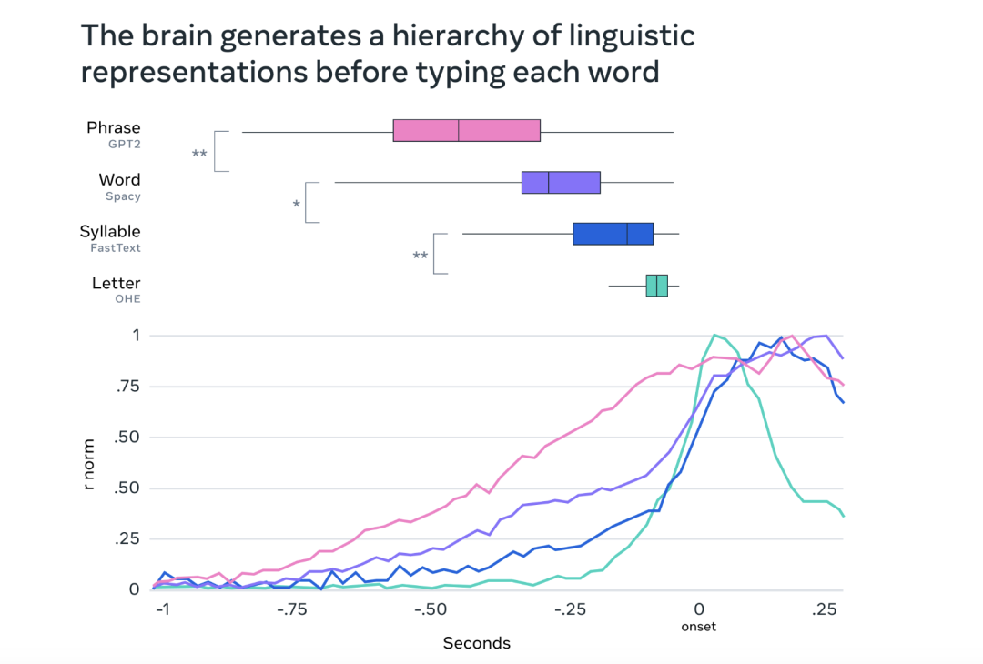 為(wei) 了探索大腦如何將想法轉化為(wei) 複雜的運動動作序列,Meta 團隊使用 AI 幫助解釋參與(yu) 者輸入句子時的 MEG 信號。通過每秒拍攝 1000 張大腦快照,他們(men) 能夠精確定位思想轉化為(wei) 單詞、音節甚至單個(ge) 字母的準確時刻。