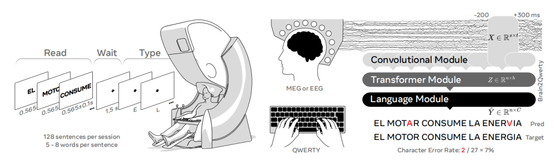 他們(men) 訓練了一個(ge) 新的 AI 模型,可以解碼來自腦電圖(EEG)或腦磁圖(MEG)的句子,參與(yu) 者則在 QWERTY 鍵盤上輸入簡短的句子。該 AI 模型可以解碼參與(yu) 者用 MEG 記錄輸入的多達 80% 的字符,平均字符錯誤率(CER)為(wei) 32% ,大大優(you) 於(yu) 傳(chuan) 統的 EEG(CER:67%)。對於(yu) 表現最佳的參與(yu) 者,該模型實現了 19% 的 CER,並且可以完美解碼訓練集之外的各種句子。