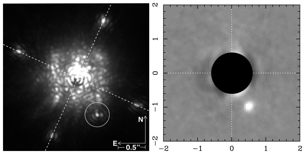 左:齊默爾曼團隊使用配備了星冕儀(yi) 的海爾望遠鏡拍攝的輔B(圓圈內(nei) ),圖像來源:Neil Zimmerman et al 2010 ApJ 709 733。右:馬馬傑克團隊使用多鏡麵望遠鏡拍攝的輔B(右下方亮點),圖像來源:Eric E. Mamajek et al 2010 AJ 139 919