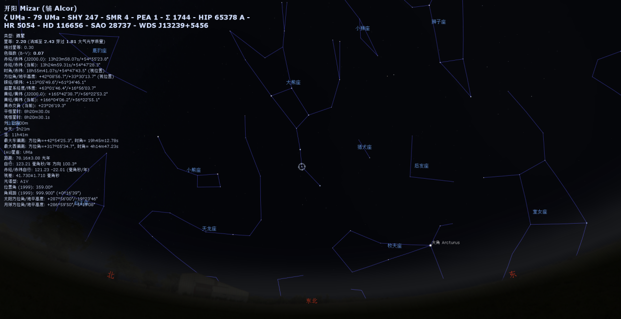開陽雙星位於(yu) 北鬥七星鬥柄末端的搖光和鬥柄上的玉衡兩(liang) 顆星之間,開陽在天球上的赤經為(wei) 13h23m55.92s,赤緯為(wei) 54°55′31.5″,距離我們(men) 約為(wei) 82.9光年,視星等約為(wei) 2.23等,是大熊座中的第四亮星;輔的赤經為(wei) 13h25m13.91s,赤緯為(wei) 54°59′17.0″,距離我們(men) 約為(wei) 81.7光年,視星等為(wei) 3.99等,比北鬥七星中最暗的天權(視星等為(wei) 3.31等)稍暗。開陽和輔之間的角距離約為(wei) 12角分,這意味著它們(men) 的真實距離約為(wei) 1.2光年。